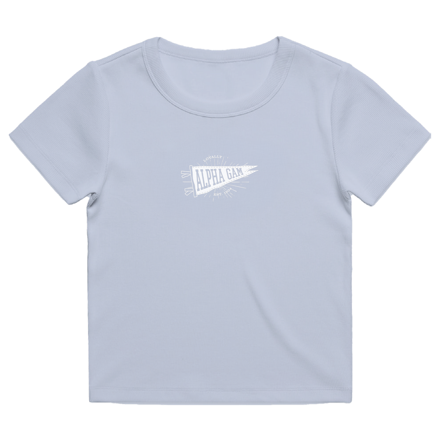 This soft pastel piece features a screen-printed vintage-inspired white pennant graphic with "Alpha Gam" and also highlights the Alpha Gam saying, “Loyally”. The year the fraternity was founded "Est. 1904," is also featured on the graphic to create a classic sorority spirit design.